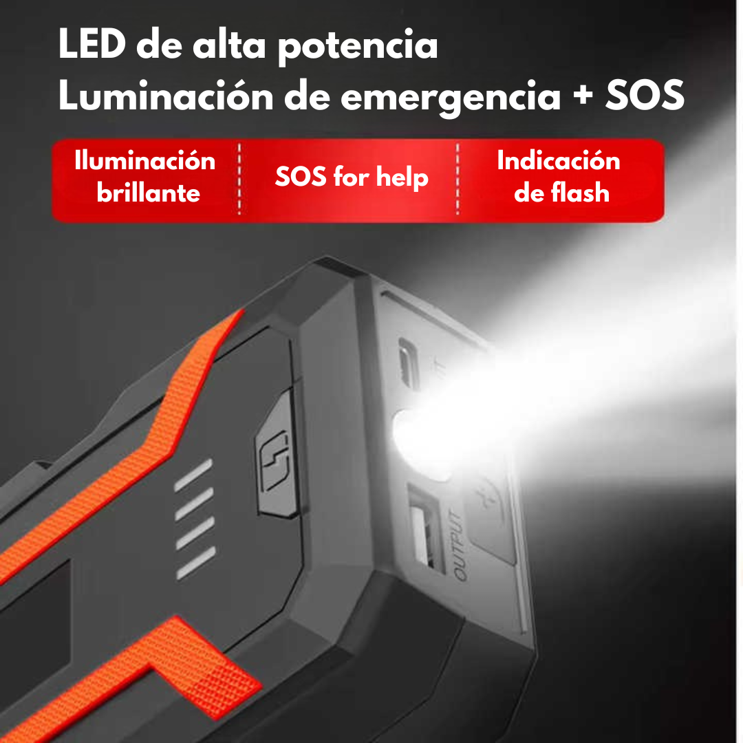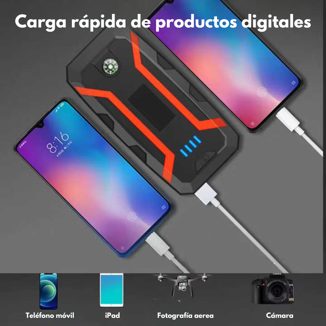 Con múltiples puertos de carga, luz de emergencia, indicador de batería y brújula integrada, este dispositivo es más que un simple arrancador.